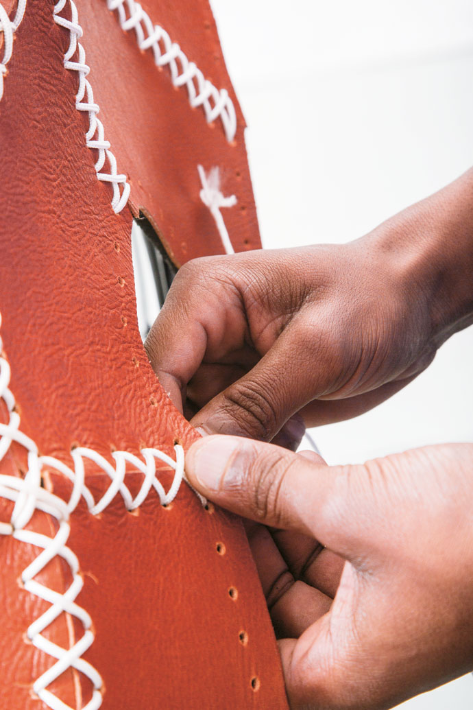 Porky consults with Geert Schuiling of Cape Town’s original leather merchant Woodhead’s to plan the outer layer of the nest. The pattern used to cut the leather is made on the steel frame.
