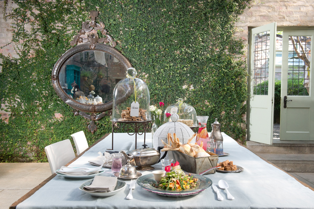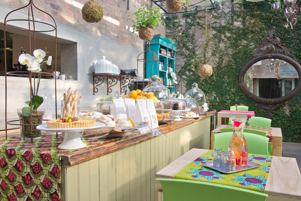 The result is a gentle, quirky space that feels a bit like finding a nook in a secret garden where you can curl your legs under you and tuck into a good book. Like a garden, the decor also changes according to the seasons and temperature of the owners’ moods. The space might take on the clean austerity of a winter’s day with white linen tablecloths, white beaded bowls and white roses or the zest and earthiness of an African bazaar, with bright, patterned cloths, mismatched crockery and country flowers.
