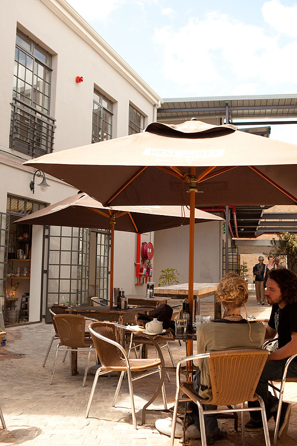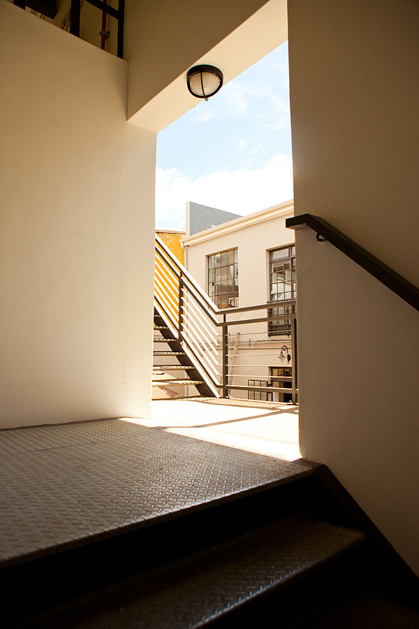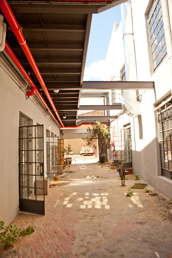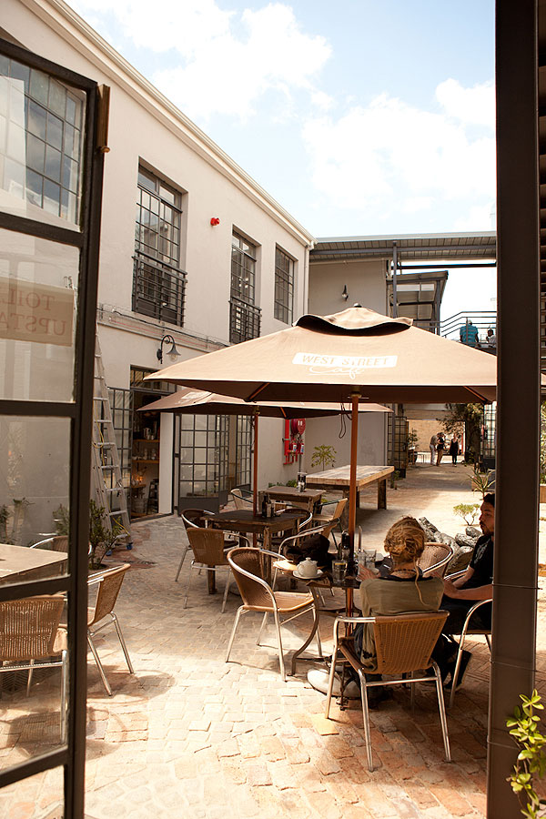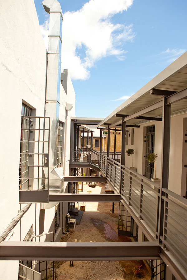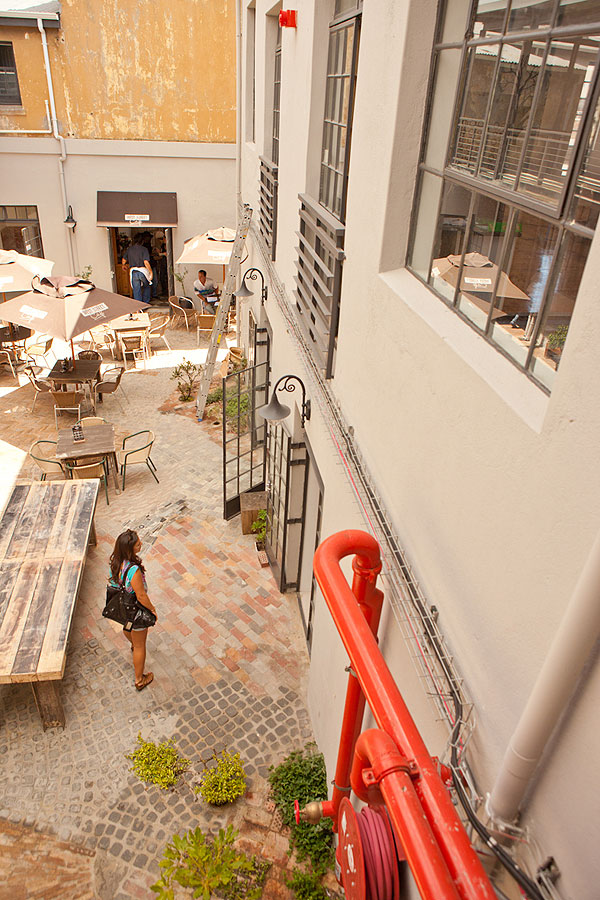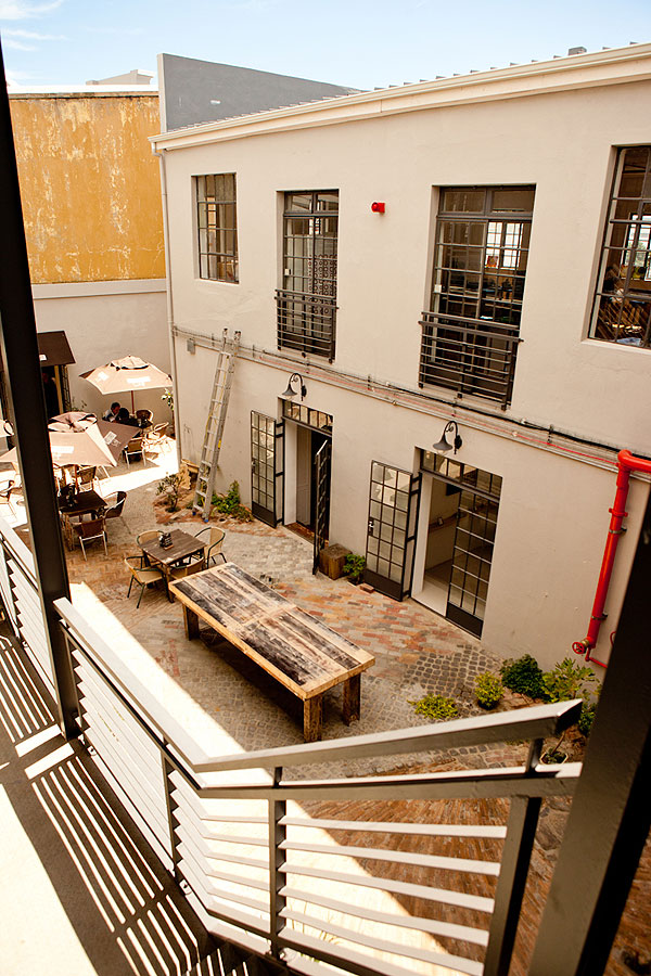 The owners (Dan Steyn, Nick van Huyssteen, Otto du Plessis and Egon Tania) had the vision of renovating the site, which consisted of two separate buildings, into a single space with a courtyard at its center. The smaller of the two buildings, which is believed to have originally housed a bar downstairs and a brothel above, is now home to West Street Café on the ground floor with four studios atop. They’ve restored the building, which boasts a beautiful wooden staircase, wooden flooring and high ceilings, an execution that maintains its simple yet original charm.