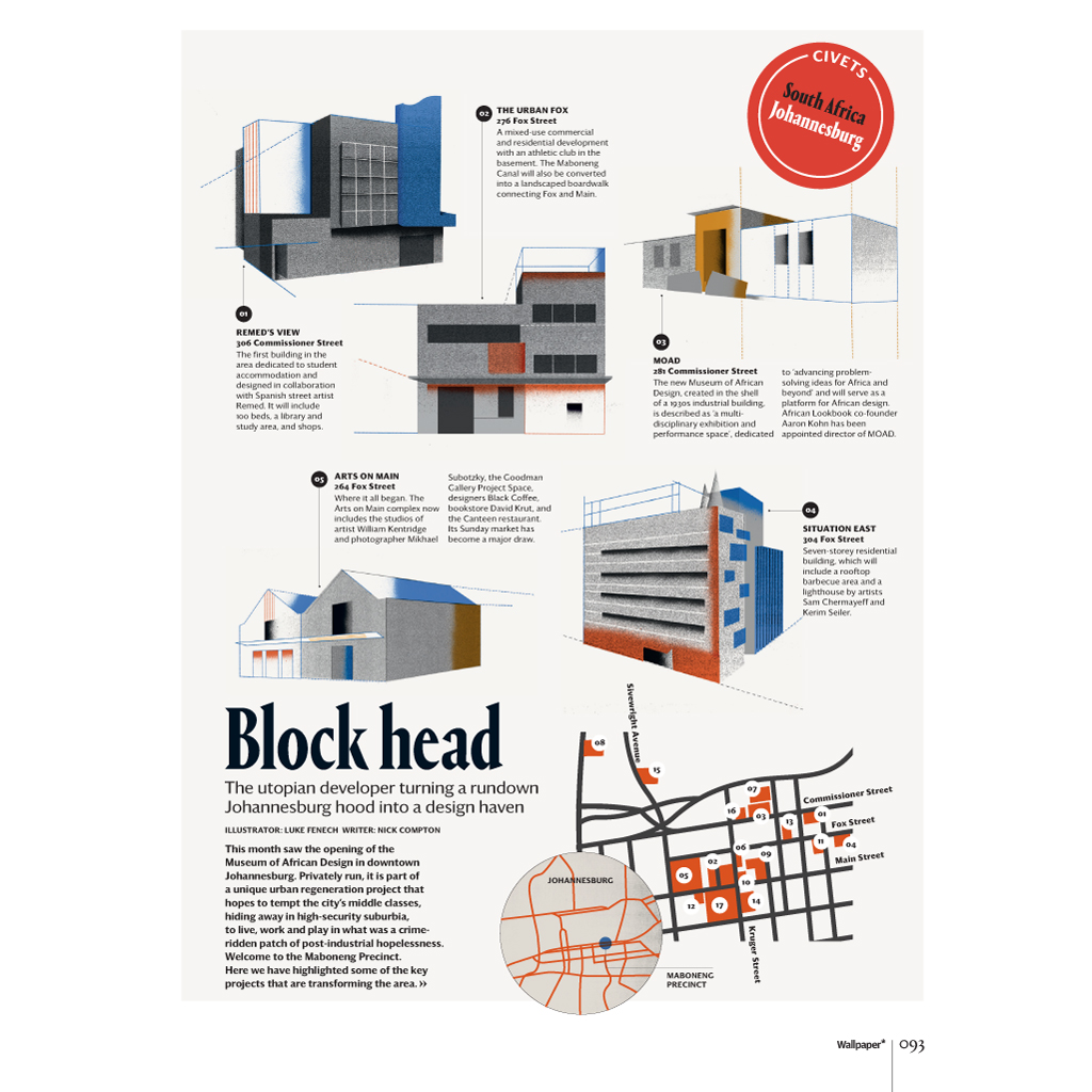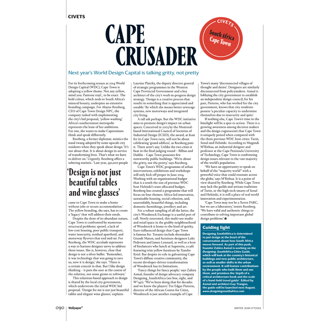 Besides a decor shot including Anatomy Design, Meyer von Wielligh, Wiid Design, Haldane Martin, Jasper Eales, 20 Eight, Adam Court and others, the November issue of Wallpaper features the Red Museum in Port Elizabeth (read VISI’s coverage here) and the Maboneng urban renewal district in Johannesburg (read VISI’s coverage here). Sean O’Toole also weighs in with an article about the World Design Capital 2014 (read VISI’s coverage here).