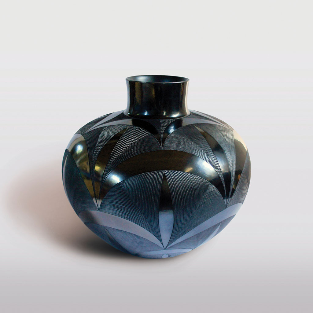 In a written interview, Ian tells us that his method gives his pots “a slight unevenness and almost imperceptible organic quality that reveals they are hand-made. After patterning the pots, the remaining spaces are burnished or polished with smooth pebbles”.