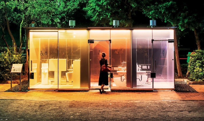 The Yoyogi Fukamachi Mini Park Toilet, by Shigeru Ban for the Tokyo Toilet project, goes opaque when in use.