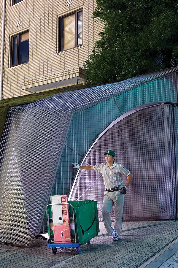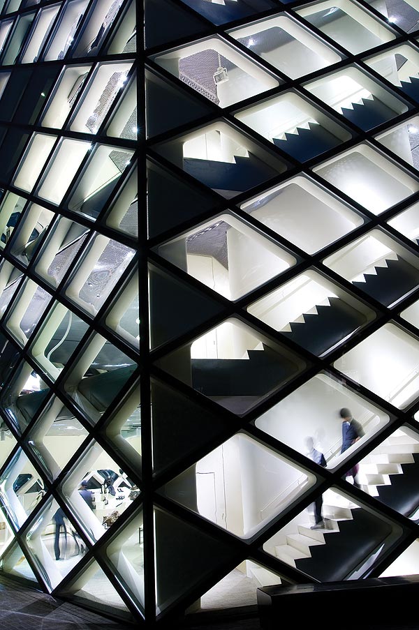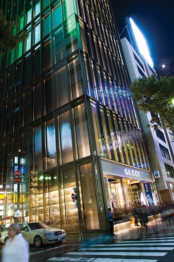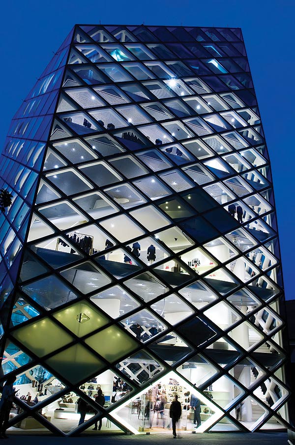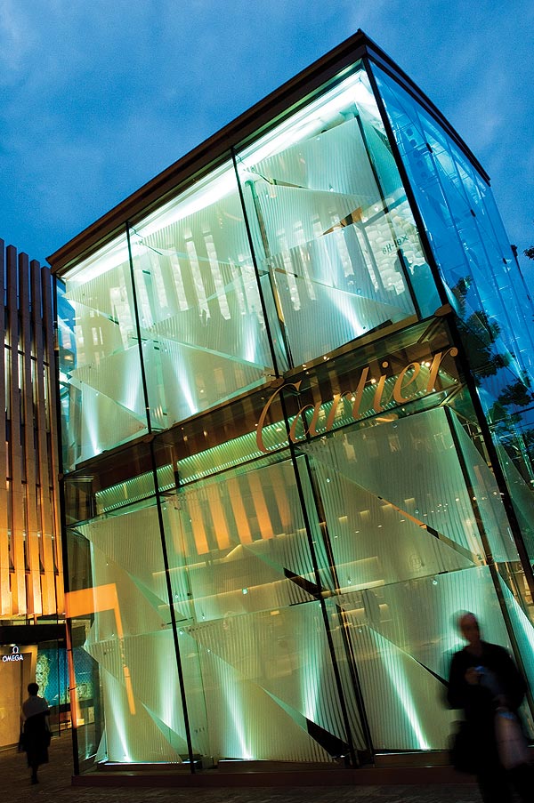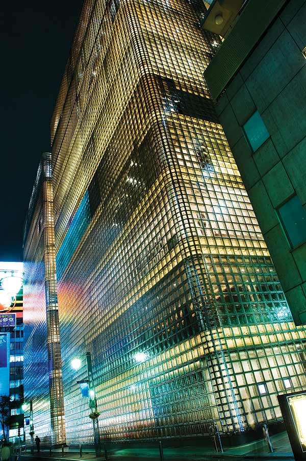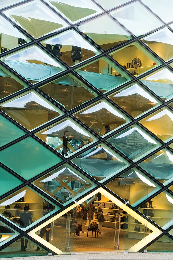 Not many years ago a daytime visit to Roppongi would not have been very productive or interesting. All this changed in 2003, with the opening of Roppongi Hills, an integrated commercial and cultural precinct that includes Jun Aoki’s bedazzling Louis Vuitton store. Much of this building’s charm is derived from its exterior facade – the design incorporates 28 000 transparent glass tubes sealed between plates of glass. Like the sparkle of a diamond this decorative wrapping, that’s meant to suggest a compound eye, produces many diffuse reflections.