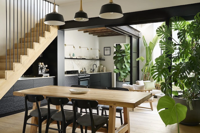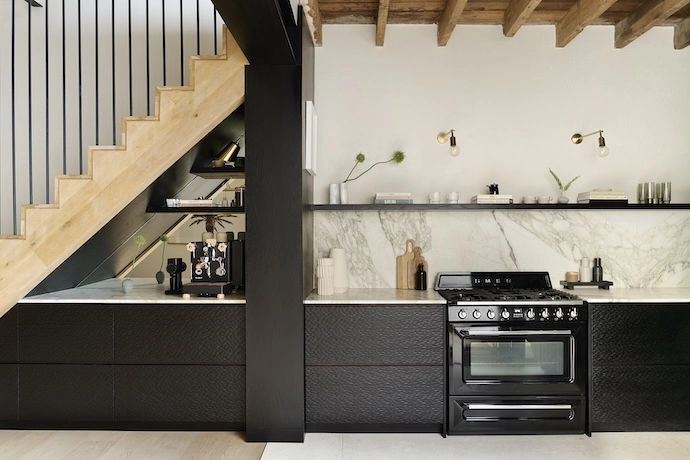 Another highlight is the coffee nook tucked beneath the staircase – a once-forgotten corner now transformed into a daily ritual space. With limited counter space and a must-have Lelit coffee machine, Laura and her team mirrored the back wall to bounce natural light and greenery into the area, turning a dark void into a reflective, living feature.
