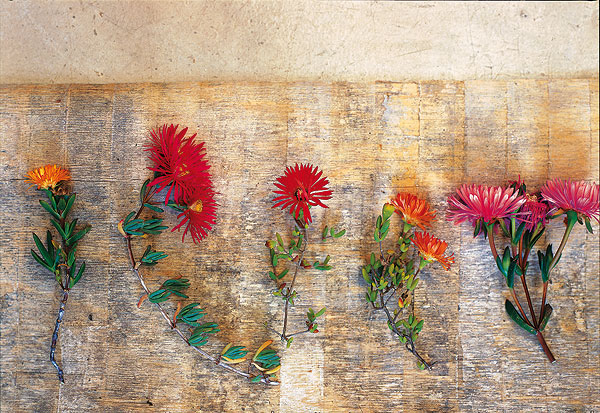 Of all our botanical curiosities, vygies are surely the strangest. From the purple and cream sheets of sour fig, to the celadon of the stone plants, they are all colour and form. The leaves are usually grey-green with a film of wax almost like that of a ripe plum – touch them and the bloom is gone.