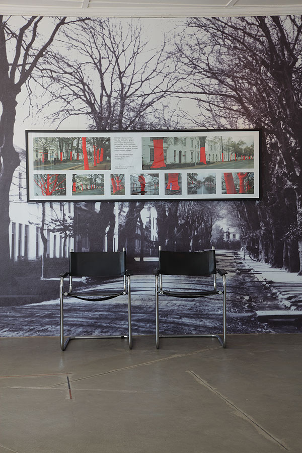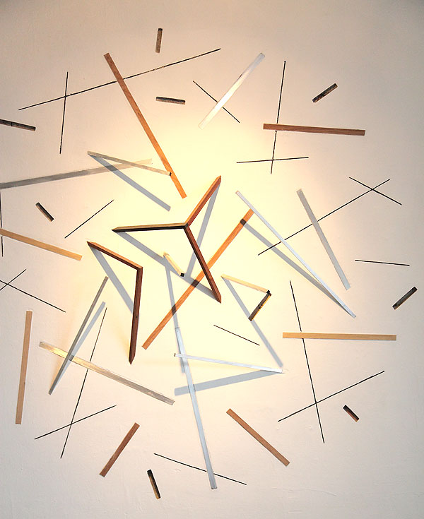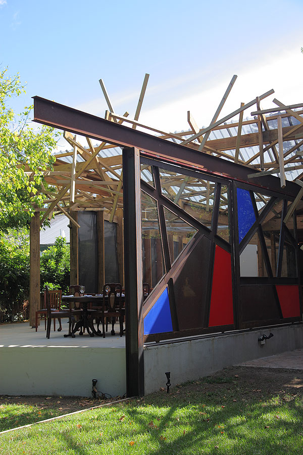 Casparus is a building unlike any other. It is primarily a work of art. The original façade remains untouched, but the inside has been opened up. The foyer, showcasing Strijdom’s installations and projects, is the entry point for a large cavernous space. Here, a narrow kitchen is hidden only by moveable screens imprinted with examples of Strijdom’s work and, against one of the few permanent walls, films of Strijdom’s transient land art are projected. The cement floors have wooden inlays; on one side of the space is a wall on wheels, featuring metal and red-and-blue shards with the appearance of glass, and on the other side is an open wall, with optional shades that can be brought down in case of inclement weather.