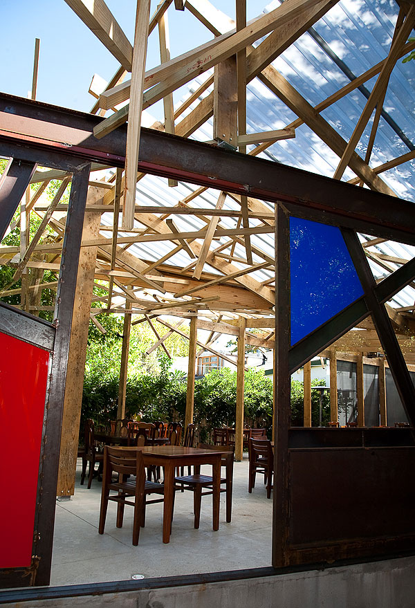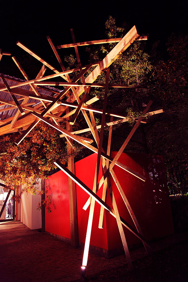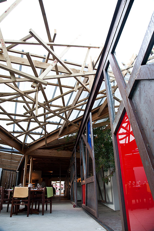 Mostly the restaurant appears to be open; part of the garden. In a strange way it feels as if you are deep within a tree, among its roots, looking out at the green leafiness, blue sky and wooden branches around and above you. Exposed as you are, you feel the slight breeze, the hot sun, the cool night air. A distinctive wooden crisscross installation, typical of Strijdom’s work, reaches up into the sky.