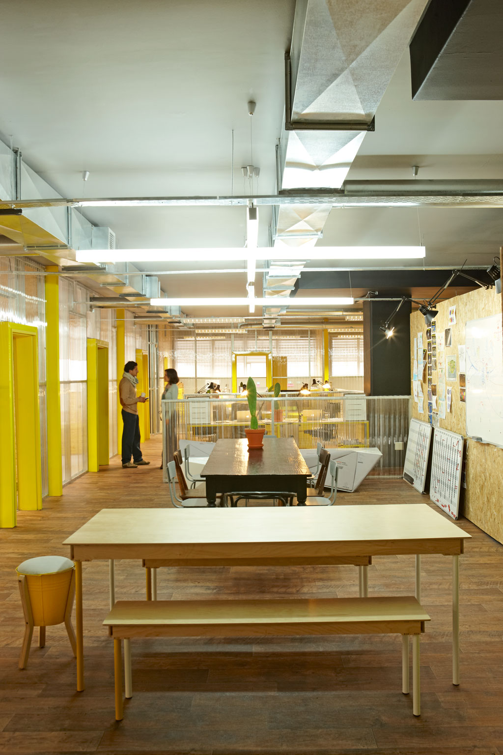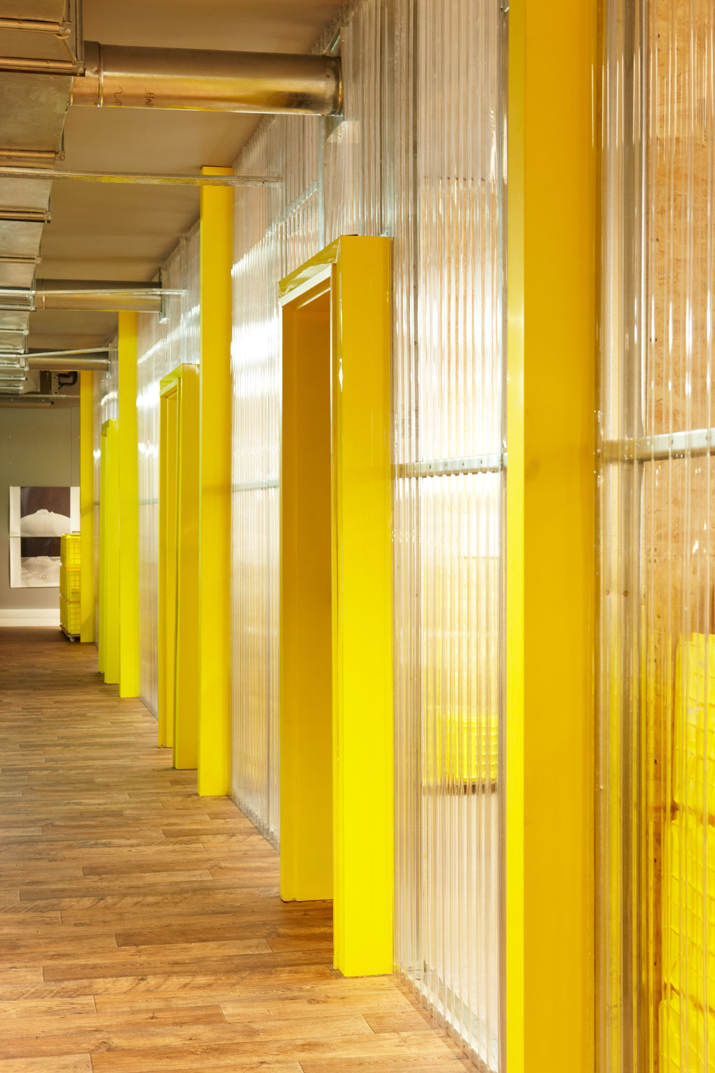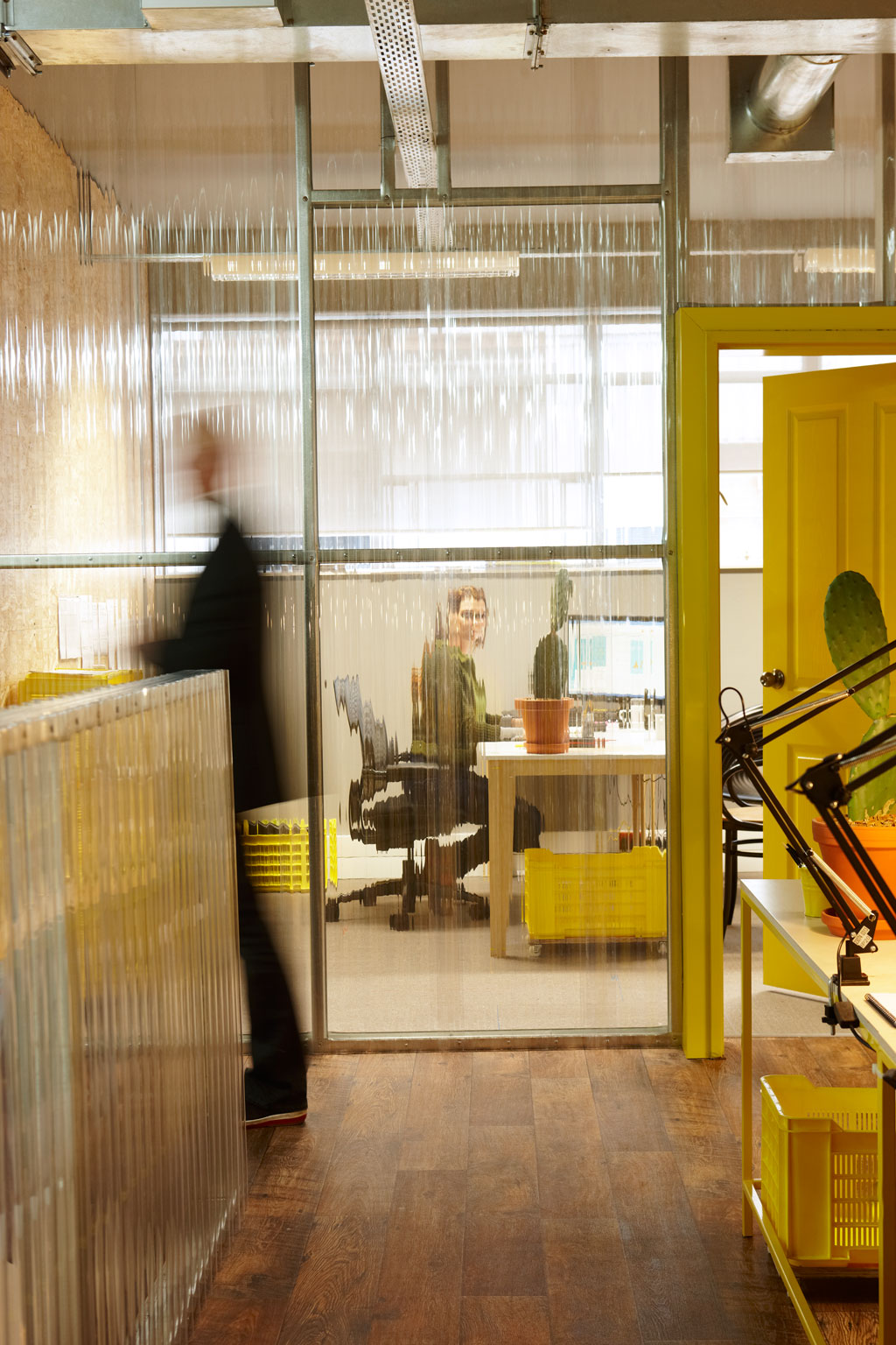The structural skeleton of the office layout is a custom-made recycled-steel frame that, when the offices are broken down after 2014, can be melted and reincarnated again. The recycled plywood and translucent corrugated Duroplastic used for partitions were also chosen for their green credentials, but moreover to allow the natural light coming in from the windows to shine through the entire office.