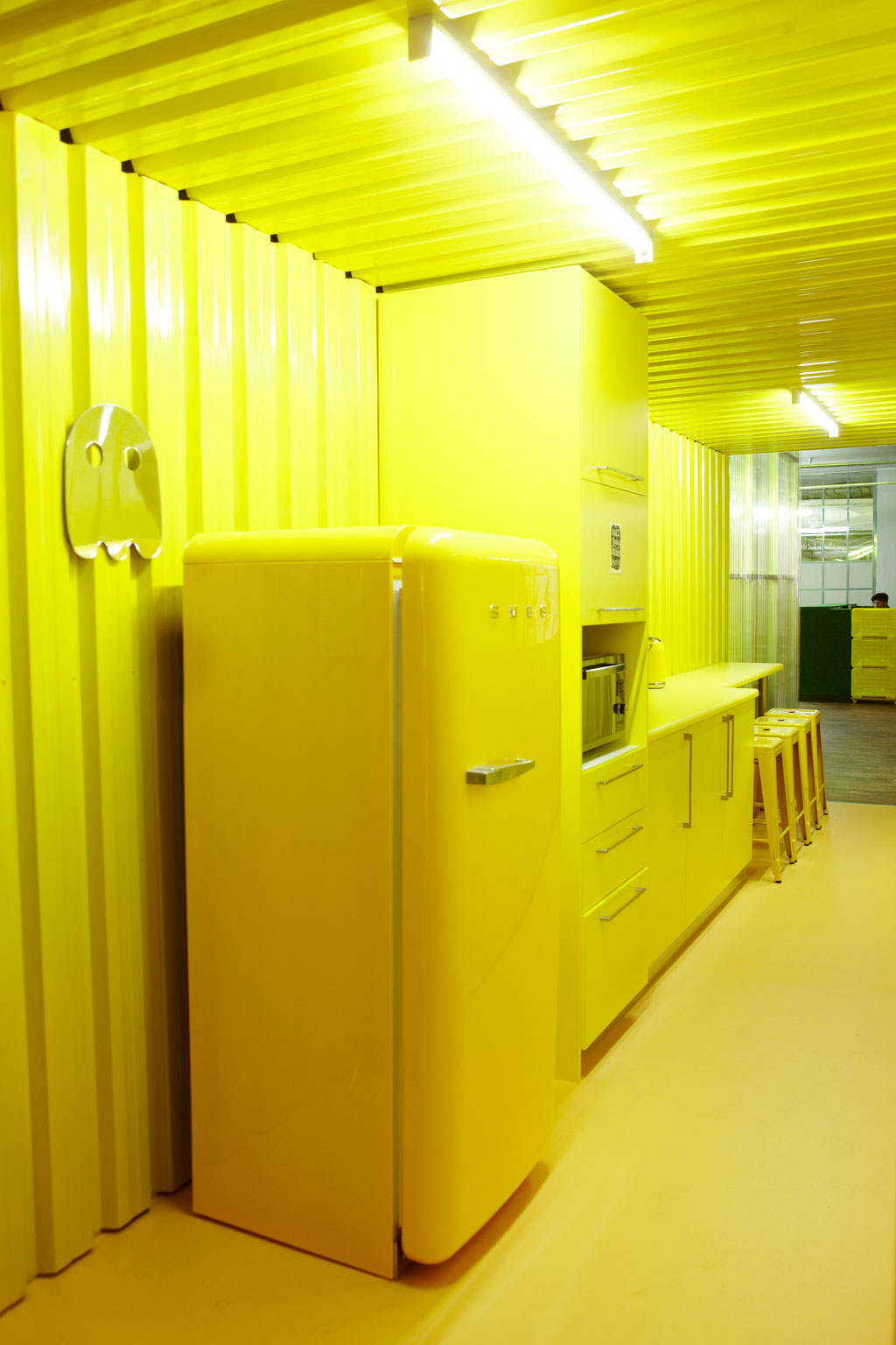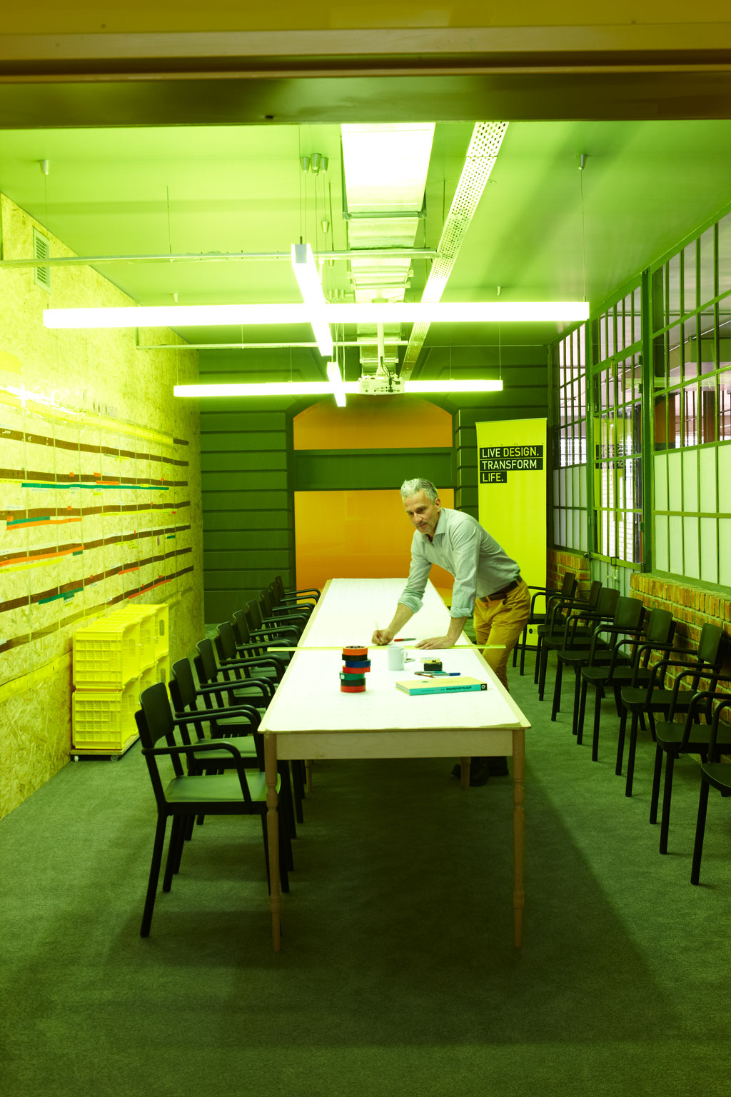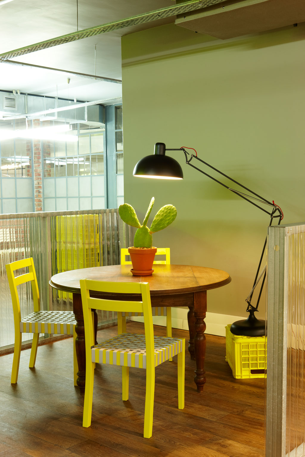 The structural skeleton of the office layout is a custom-made recycled-steel frame that, when the offices are broken down after 2014, can be melted and reincarnated again. The recycled plywood and translucent corrugated Duroplastic used for partitions were also chosen for their green credentials, but moreover to allow the natural light coming in from the windows to shine through the entire office.