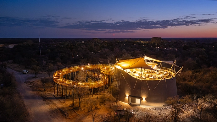 Inspired by the local environment, SkyBoma’s sculpted base reinterprets the organic geometry of Namibia’s termite mounds, while its canvas roof mirrors the bold silhouette of the native Omajova mushroom. From above, the looping walkway forms an infinity symbol – a subtle nod to the enduring nature of the bush.